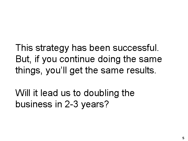 | This strategy has been successful. But, if you continue doing the same things, you'll get the same results. Will it lead us to doubling the business in 2-3 years? |