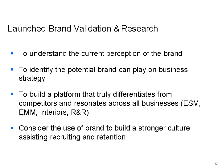 | Launched Brand Validation & Research To understand the current perception of the brand To identify the potential brand can play on business strategy To build a platform that truly differentiates from competitors and resonates across all businesses (ESM, EMM, Interiors, R&R) Consider the use of brand to build a stronger culture assisting recruiting and retention |