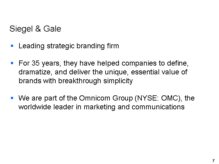 | Siegel & Gale Leading strategic branding firm For 35 years, they have helped companies to define, dramatize, and deliver the unique, essential value of brands with breakthrough simplicity We are part of the Omnicom Group (NYSE: OMC), the worldwide leader in marketing and communications |