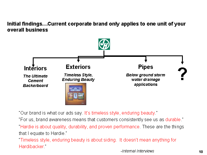 | Initial findings...Current corporate brand only applies to one unit of your overall business "Our brand is what our ads say. It's timeless style, enduring beauty." "For us, brand awareness means that customers consistently see us as durable." "Hardie is about quality, durability, and proven performance. These are the things that I equate to Hardie." "Timeless style, enduring beauty is about siding. It doesn't mean anything for Hardibacker." -Internal Interviews Exteriors Timeless Style, Enduring Beauty The Ultimate Cement Backerboard Pipes ? Below ground storm water drainage applications Interiors |
