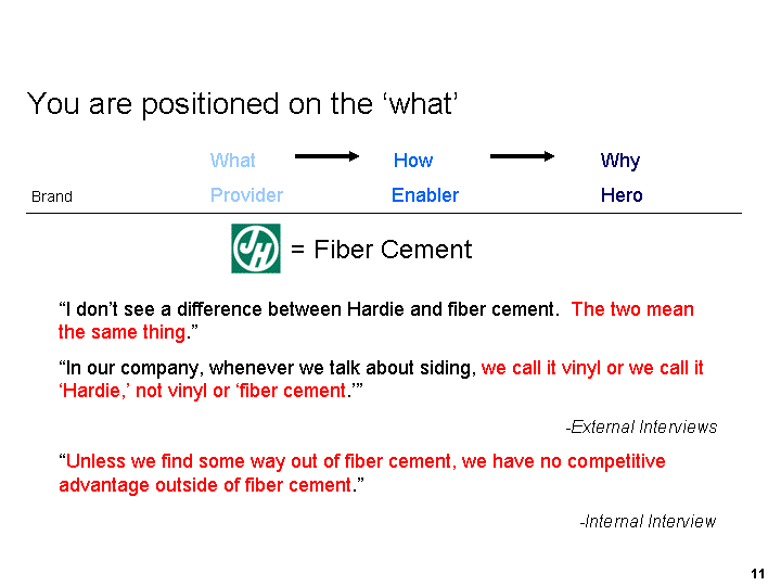 | Provider Enabler Hero Brand You are positioned on the 'what' What How Why = Fiber Cement "I don't see a difference between Hardie and fiber cement. The two mean the same thing." "In our company, whenever we talk about siding, we call it vinyl or we call it 'Hardie,' not vinyl or 'fiber cement.'" -External Interviews "Unless we find some way out of fiber cement, we have no competitive advantage outside of fiber cement." -Internal Interview |