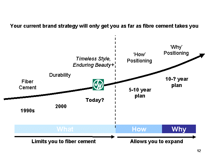 | Your current brand strategy will only get you as far as fibre cement takes you Fiber Cement 1990s Durability 2000 Timeless Style, Enduring Beauty+ Today? 'How' Positioning 5-10 year plan 'Why' Positioning 10-? year plan What How Why Limits you to fiber cement Allows you to expand |