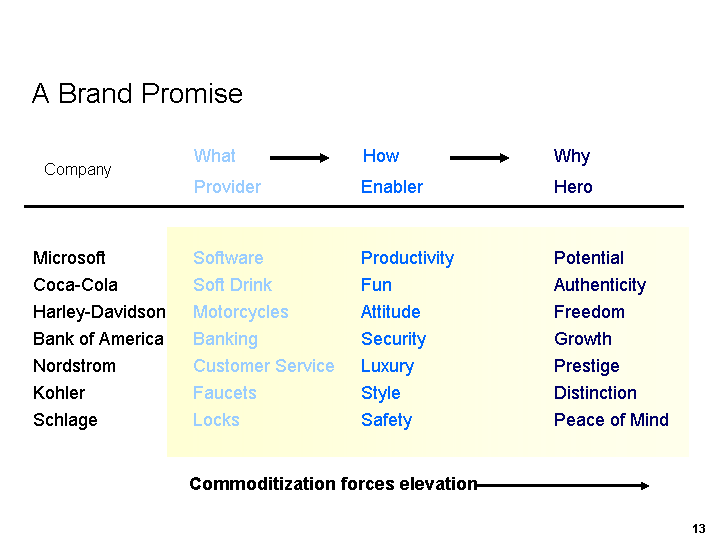 | A Brand Promise Commoditization forces elevation Microsoft Coca-Cola Harley-Davidson Bank of America Nordstrom Kohler Schlage Productivity Fun Attitude Security Luxury Style Safety Potential Authenticity Freedom Growth Prestige Distinction Peace of Mind Provider Enabler Hero Company What How Why Software Soft Drink Motorcycles Banking Customer Service Faucets Locks |