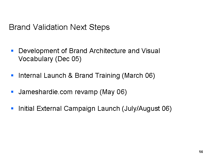 | Brand Validation Next Steps Development of Brand Architecture and Visual Vocabulary (Dec 05) Internal Launch & Brand Training (March 06) Jameshardie.com revamp (May 06) Initial External Campaign Launch (July/August 06) |