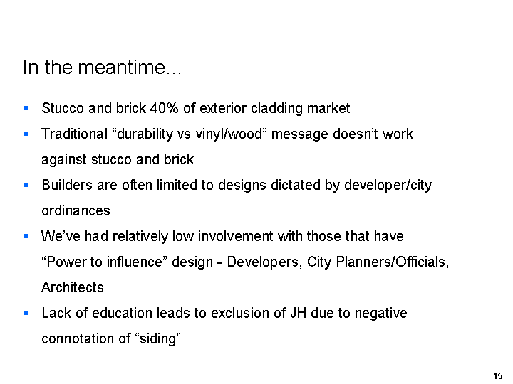 | In the meantime... Stucco and brick 40% of exterior cladding market Traditional "durability vs vinyl/wood" message doesn't work against stucco and brick Builders are often limited to designs dictated by developer/city ordinances We've had relatively low involvement with those that have "Power to influence" design - Developers, City Planners/Officials, Architects Lack of education leads to exclusion of JH due to negative connotation of "siding" |
