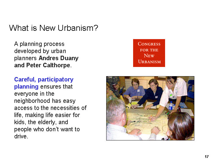 | A planning process developed by urban planners Andres Duany and Peter Calthorpe. Careful, participatory planning ensures that everyone in the neighborhood has easy access to the necessities of life, making life easier for kids, the elderly, and people who don't want to drive. What is New Urbanism? What is New Urbanism? |