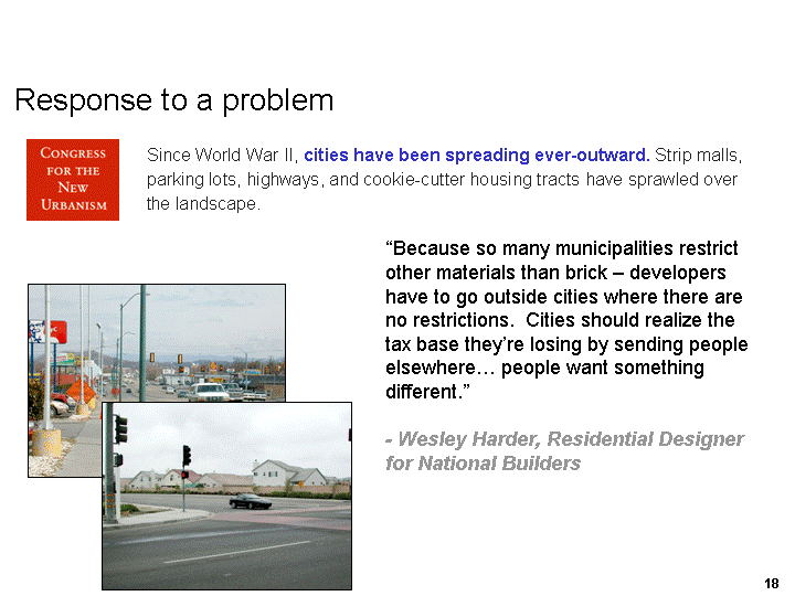 | Since World War II, cities have been spreading ever-outward. Strip malls, parking lots, highways, and cookie-cutter housing tracts have sprawled over the landscape. Response to a problem "Because so many municipalities restrict other materials than brick - developers have to go outside cities where there are no restrictions. Cities should realize the tax base they're losing by sending people elsewhere... people want something different." - - Wesley Harder, Residential Designer for National Builders |