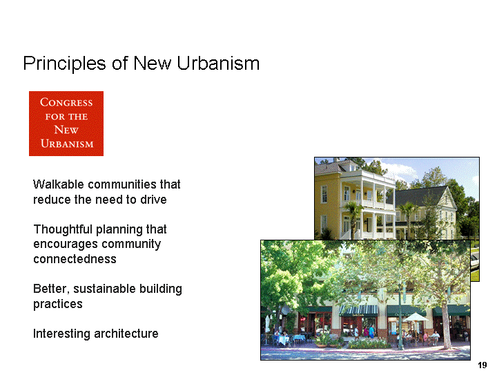 | Walkable communities that reduce the need to drive Thoughtful planning that encourages community connectedness Better, sustainable building practices Interesting architecture Principles of New Urbanism Principles of New Urbanism |
