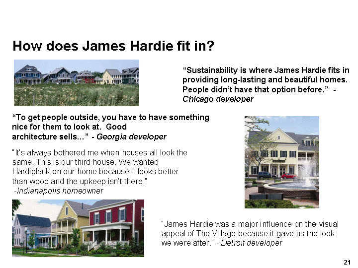 | How does James Hardie fit in? "Sustainability is where James Hardie fits in providing long-lasting and beautiful homes. People didn't have that option before." - Chicago developer "To get people outside, you have to have something nice for them to look at. Good architecture sells..." - Georgia developer "It's always bothered me when houses all look the same. This is our third house. We wanted Hardiplank on our home because it looks better than wood and the upkeep isn't there." -Indianapolis homeowner "James Hardie was a major influence on the visual appeal of The Village because it gave us the look we were after." - Detroit developer |