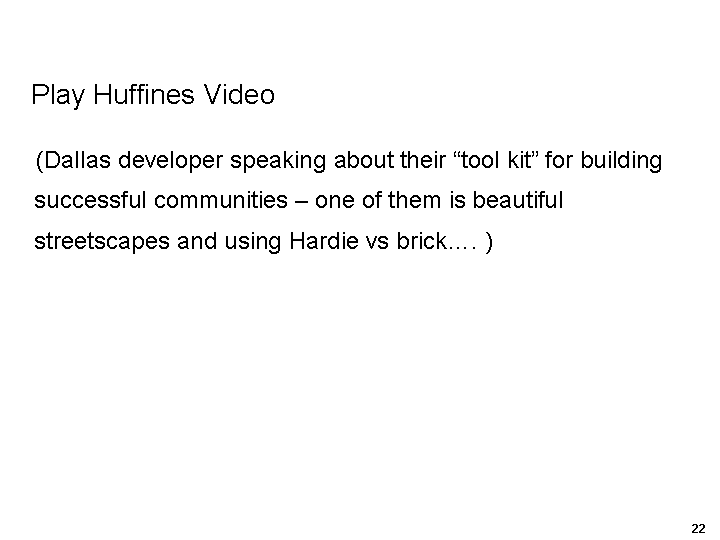 | Play Huffines Video (Dallas developer speaking about their "tool kit" for building successful communities - one of them is beautiful streetscapes and using Hardie vs brick.... ) |