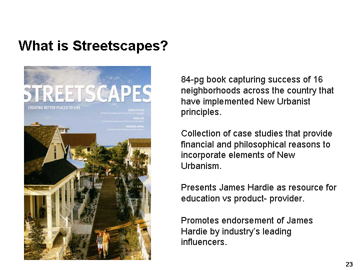 | 84-pg book capturing success of 16 neighborhoods across the country that have implemented New Urbanist principles. What is Streetscapes? Collection of case studies that provide financial and philosophical reasons to incorporate elements of New Urbanism. Presents James Hardie as resource for education vs product- provider. Promotes endorsement of James Hardie by industry's leading influencers. |