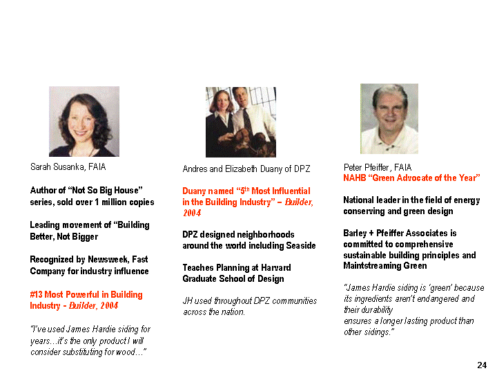 | Sarah Susanka, FAIA Author of "Not So Big House" series, sold over 1 million copies Leading movement of "Building Better, Not Bigger Recognized by Newsweek, Fast Company for industry influence #13 Most Powerful in Building Industry - Builder, 2004 "I've used James Hardie siding for years...it's the only product I will consider substituting for wood..." Andres and Elizabeth Duany of DPZ Duany named "5th Most Influential in the Building Industry" - Builder, 2004 DPZ designed neighborhoods around the world including Seaside Teaches Planning at Harvard Graduate School of Design JH used throughout DPZ communities across the nation. Peter Pfeiffer, FAIA NAHB "Green Advocate of the Year" National leader in the field of energy conserving and green design Barley + Pfeiffer Associates is committed to comprehensive sustainable building principles and Maintstreaming Green "James Hardie siding is 'green' because its ingredients aren't endangered and their durability ensures a longer lasting product than other sidings." |