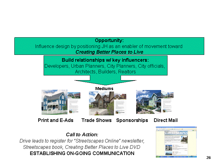 | Print and E-Ads Opportunity: Influence design by positioning JH as an enabler of movement toward Creating Better Places to Live Build relationships w/ key influencers: Developers, Urban Planners, City Planners, City officials, Architects, Builders, Realtors Mediums Call to Action: Drive leads to register for "Streetscapes Online" newsletter, Streetscapes book, Creating Better Places to Live DVD ESTABLISHING ON-GOING COMMUNICATION Trade Shows Sponsorships Direct Mail Direct Mail |