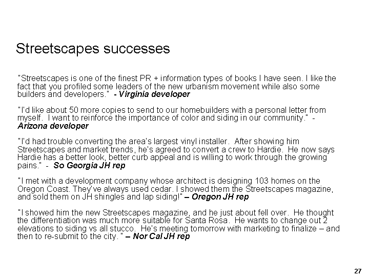 | Streetscapes successes "Streetscapes is one of the finest PR + information types of books I have seen. I like the fact that you profiled some leaders of the new urbanism movement while also some builders and developers." - Virginia developer "I'd like about 50 more copies to send to our homebuilders with a personal letter from myself. I want to reinforce the importance of color and siding in our community." - Arizona developer "I'd had trouble converting the area's largest vinyl installer. After showing him Streetscapes and market trends, he's agreed to convert a crew to Hardie. He now says Hardie has a better look, better curb appeal and is willing to work through the growing pains." - So Georgia JH rep "I met with a development company whose architect is designing 103 homes on the Oregon Coast. They've always used cedar. I showed them the Streetscapes magazine, and sold them on JH shingles and lap siding!" - Oregon JH rep "I showed him the new Streetscapes magazine, and he just about fell over. He thought the differentiation was much more suitable for Santa Rosa. He wants to change out 2 elevations to siding vs all stucco. He's meeting tomorrow with marketing to finalize - and then to re-submit to the city. " - Nor Cal JH rep |