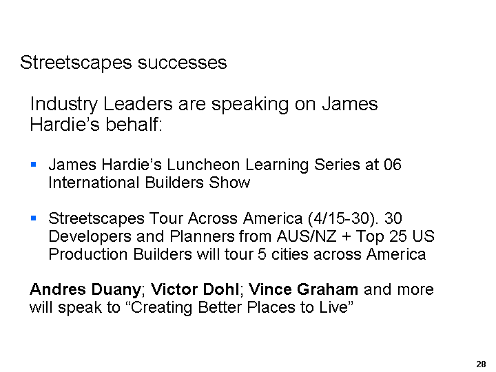| Industry Leaders are speaking on James Hardie's behalf: James Hardie's Luncheon Learning Series at 06 International Builders Show Streetscapes Tour Across America (4/15-30). 30 Developers and Planners from AUS/NZ + Top 25 US Production Builders will tour 5 cities across America Andres Duany; Victor Dohl; Vince Graham and more will speak to "Creating Better Places to Live" Streetscapes successes |