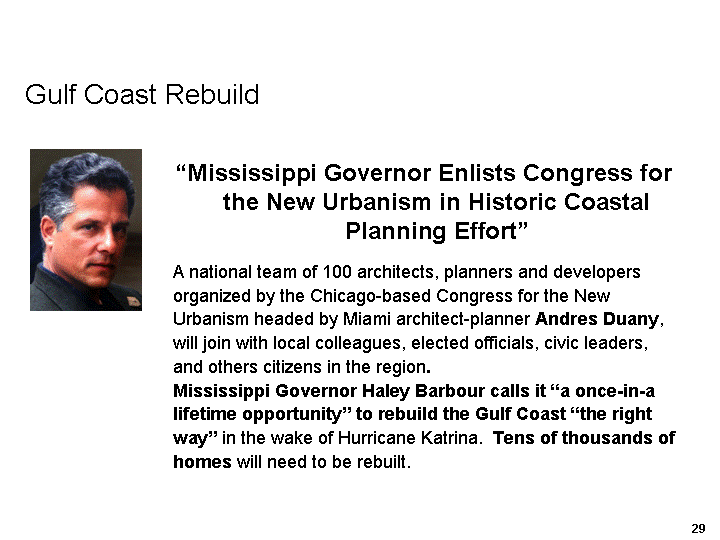 | "Mississippi Governor Enlists Congress for the New Urbanism in Historic Coastal Planning Effort" A national team of 100 architects, planners and developers organized by the Chicago-based Congress for the New Urbanism headed by Miami architect-planner Andres Duany, will join with local colleagues, elected officials, civic leaders, and others citizens in the region. Mississippi Governor Haley Barbour calls it "a once-in-a lifetime opportunity" to rebuild the Gulf Coast "the right way" in the wake of Hurricane Katrina. Tens of thousands of homes will need to be rebuilt. Gulf Coast Rebuild |