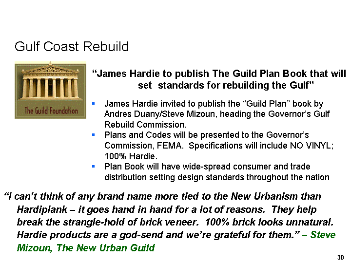 | Gulf Coast Rebuild "James Hardie to publish The Guild Plan Book that will set standards for rebuilding the Gulf" James Hardie invited to publish the "Guild Plan" book by Andres Duany/Steve Mizoun, heading the Governor's Gulf Rebuild Commission. Plans and Codes will be presented to the Governor's Commission, FEMA. Specifications will include NO VINYL; 100% Hardie. Plan Book will have wide-spread consumer and trade distribution setting design standards throughout the nation "I can't think of any brand name more tied to the New Urbanism than Hardiplank - it goes hand in hand for a lot of reasons. They help break the strangle-hold of brick veneer. 100% brick looks unnatural. Hardie products are a god-send and we're grateful for them." - Steve Mizoun, The New Urban Guild |
