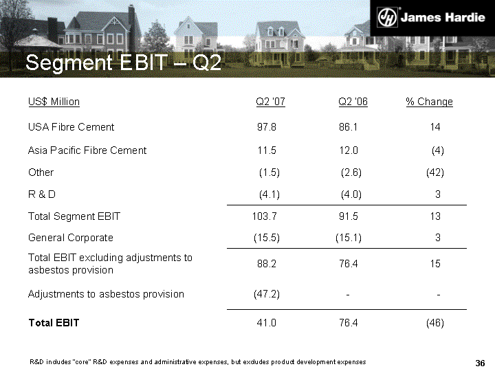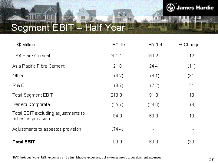 asbestos provision. EBIT excluding adjustments to asbestos provision increased by 15% to US$88.2