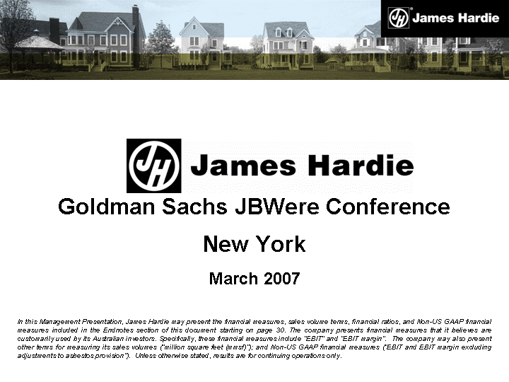| Goldman Sachs JBWere Conference New York March 2007 In this Management Presentation, James Hardie may present the financial measures, sales volume terms, financial ratios, and Non-US GAAP financial measures included in the Endnotes section of this document starting on page 30. The company presents financial measures that it believes are customarily used by its Australian investors. Specifically, these financial measures include "EBIT" and "EBIT margin". The company may also present other terms for measuring its sales volumes ("million square feet (mmsf)"); and Non-US GAAP financial measures ("EBIT and EBIT margin excluding adjustments to asbestos provision"). Unless otherwise stated, results are for continuing operations only. |