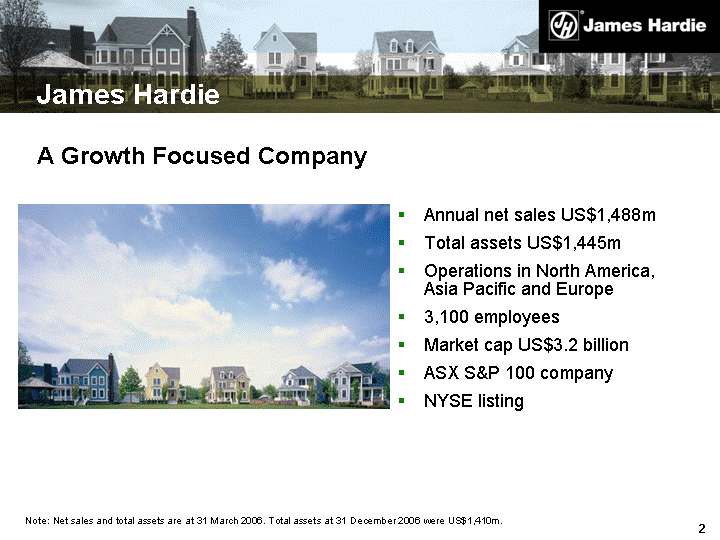 | James Hardie Annual net sales US$1,488m Total assets US$1,445m Operations in North America, Asia Pacific and Europe 3,100 employees Market cap US$3.2 billion ASX S&P 100 company NYSE listing Note: Net sales and total assets are at 31 March 2006. Total assets at 31 December 2006 were US$1,410m. A Growth Focused Company |