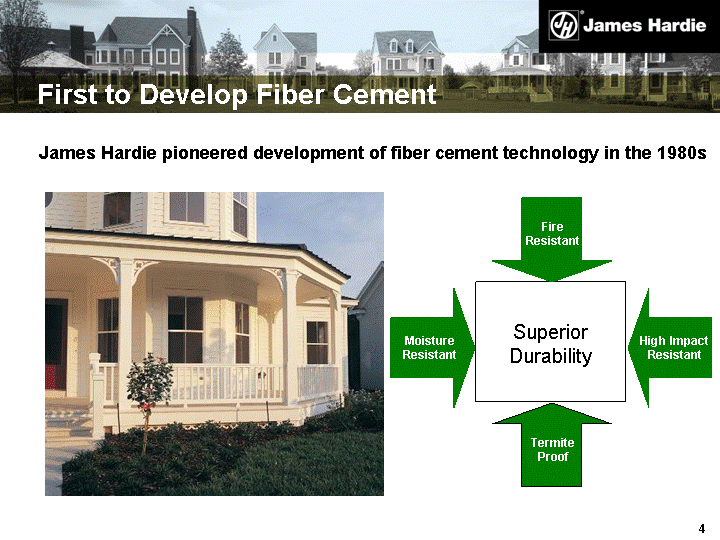 | First to Develop Fiber Cement James Hardie pioneered development of fiber cement technology in the 1980s James Hardie pioneered development of fiber cement technology in the 1980s Superior Durability Fire Resistant High Impact Resistant Moisture Resistant Termite Proof |