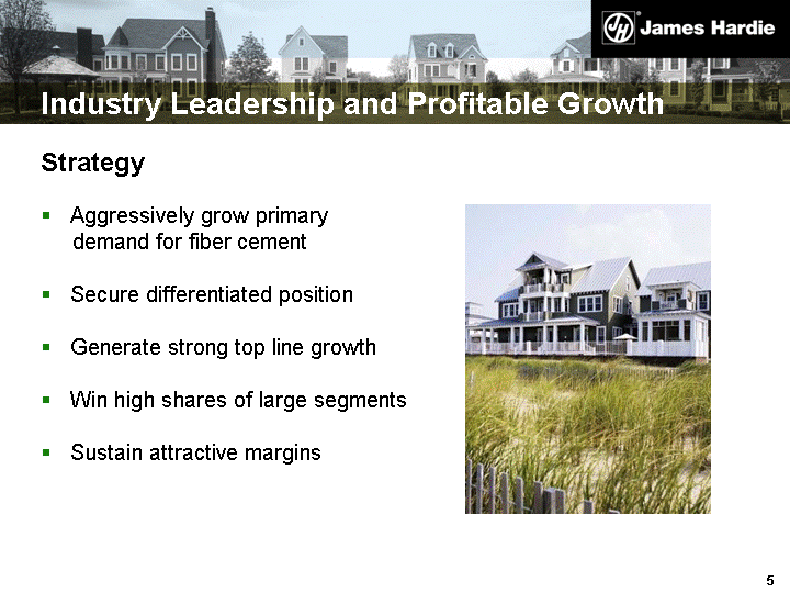 | Industry Leadership and Profitable Growth Aggressively grow primary demand for fiber cement Secure differentiated position Generate strong top line growth Win high shares of large segments Sustain attractive margins Strategy |