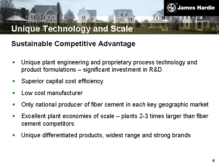 | Unique Technology and Scale Unique plant engineering and proprietary process technology and product formulations - significant investment in R&D Superior capital cost efficiency Low cost manufacturer Only national producer of fiber cement in each key geographic market Excellent plant economies of scale - plants 2-3 times larger than fiber cement competitors Unique differentiated products, widest range and strong brands Sustainable Competitive Advantage |