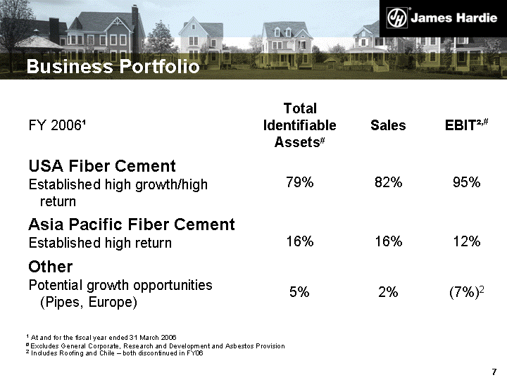 | Business Portfolio FY 20061 Total Identifiable Assets# Sales EBIT2,# USA Fiber Cement Established high growth/high return 79% 82% 95% Asia Pacific Fiber Cement Established high return 16% 16% 12% Other Potential growth opportunities (Pipes, Europe) 5% 2% (7%)2 1 At and for the fiscal year ended 31 March 2006 # Excludes General Corporate, Research and Development and Asbestos Provision 2 Includes Roofing and Chile - both discontinued in FY06 |