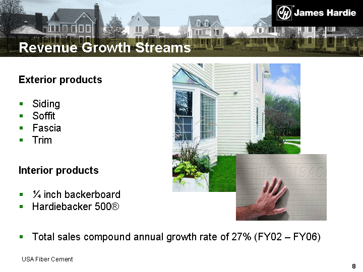 | Revenue Growth Streams Exterior products Siding Soffit Fascia Trim Interior products 1/4 inch backerboard Hardiebacker 500(r) Total sales compound annual growth rate of 27% (FY02 - FY06) USA Fiber Cement |