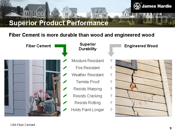 | Superior Product Performance Fiber Cement is more durable than wood and engineered wood Fiber Cement Superior Durability Moisture Resistant Fire Resistant Weather Resistant Termite Proof Resists Warping Resists Cracking Resists Rotting Holds Paint Longer ? ? ? ? ? ? ? ? ? ? ? ? ? ? ? ? Engineered Wood USA Fiber Cement |