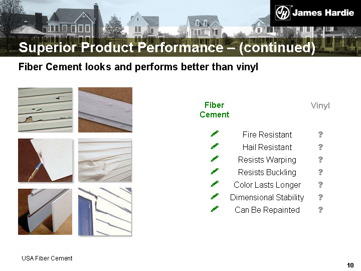 | Superior Product Performance - (continued) Fiber Cement looks and performs better than vinyl Vinyl Fire Resistant Hail Resistant Resists Warping Resists Buckling Color Lasts Longer Dimensional Stability Can Be Repainted ? ? ? ? ? ? ? ? ? ? ? ? ? ? Fiber Cement USA Fiber Cement |