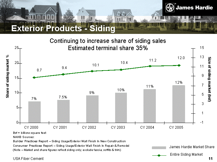 | Exterior Products - Siding Continuing to increase share of siding sales Estimated terminal share 35% Bsf = billions square feet NAHB Sources: Builder Practices Report - Siding Usage/Exterior Wall Finish In New Construction Consumer Practices Report - Siding Usage/Exterior Wall Finish In Repair & Remodel (Note - Market and share figures reflect siding only; exclude fascia, soffits & trim) James Hardie Market Share Entire Siding Market 7% 7.5% 9% 10% 11% 12% 8.7 9.4 10.1 10.4 11.2 12.0 0 5 10 15 20 25 CY 2000 CY 2001 CY 2002 CY 2003 CY 2004 CY 2005 Share of siding market % - -1 1 3 5 7 9 11 13 15 Size of siding market (bsf) USA Fiber Cement |