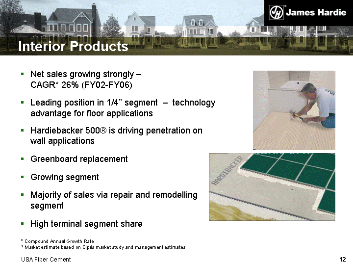 | Interior Products Net sales growing strongly - CAGR* 26% (FY02-FY06) Leading position in 1/4" segment - technology advantage for floor applications Hardiebacker 500(r) is driving penetration on wall applications Greenboard replacement Growing segment Majority of sales via repair and remodelling segment High terminal segment share * Compound Annual Growth Rate 1 Market estimate based on Cipris market study and management estimates USA Fiber Cement |