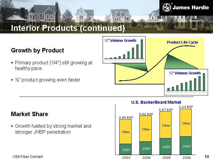 | Interior Products (continued) Product Life Cycle 1/4" Volume Growth 1/2" Volume Growth Growth by Product Primary product (1/4") still growing at healthy pace. 1/2" product growing even faster Market Share Growth fuelled by strong market and stronger JHBP penetration Other JHBP Other JHBP Other JHBP Other JHBP 2003 2004 2005 2006 0.88 BSF 0.96 BSF 1.07 BSF 1.14 BSF U.S. BackerBoard Market USA Fiber Cement |