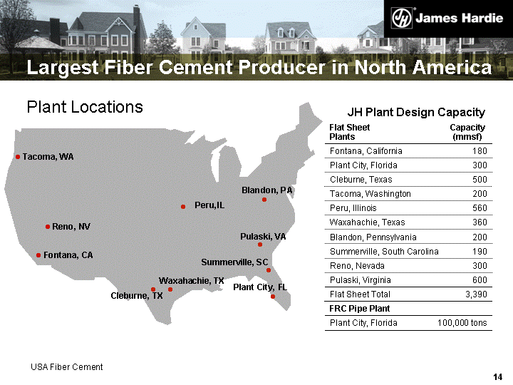 | Largest Fiber Cement Producer in North America Flat Sheet Plants Flat Sheet Plants Capacity (mmsf) Fontana, California Fontana, California 180 Plant City, Florida Plant City, Florida 300 Cleburne, Texas Cleburne, Texas 500 Tacoma, Washington Tacoma, Washington 200 Peru, Illinois Peru, Illinois 560 Waxahachie, Texas Waxahachie, Texas 360 Blandon, Pennsylvania Blandon, Pennsylvania 200 Summerville, South Carolina Summerville, South Carolina 190 Reno, Nevada Reno, Nevada 300 Pulaski, Virginia Pulaski, Virginia 600 Flat Sheet Total Flat Sheet Total 3,390 FRC Pipe Plant FRC Pipe Plant Plant City, Florida 100,000 tons 100,000 tons JH Plant Design Capacity Plant Locations USA Fiber Cement Tacoma, WA Plant City, FL Waxahachie, TX Cleburne, TX Peru, IL Blandon, PA Summerville, SC Pulaski, VA Reno, NV Fontana, CA |