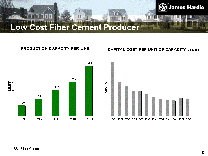 | Low Cost Fiber Cement Producer USA Fiber Cement CAPITAL COST PER UNIT OF CAPACITY (US$/SF) 0.1 0.15 0.2 0.25 0.3 0.35 0.4 FY91 FY96 FY97 FY98 FY99 FY00 FY01 FY02 FY03 FY05 FY06 FY07 $US / SF PRODUCTION CAPACITY PER LINE 60 100 150 200 300 0.1 50.1 100.1 150.1 200.1 250.1 300.1 350.1 1990 1994 1998 2001 2000 MMSF |