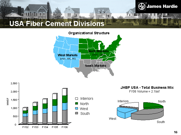 | USA Fiber Cement Divisions Organizational Structure West Markets (incl. AK, HI) North Markets (incl. Can) South Markets Interiors North West 0 500 1,000 1,500 2,000 2,500 MMSF FY02 FY03 FY04 FY05 FY06 South West JHBP USA - Total Business Mix FY06 Volume = 2.1bsf North South Interiors |