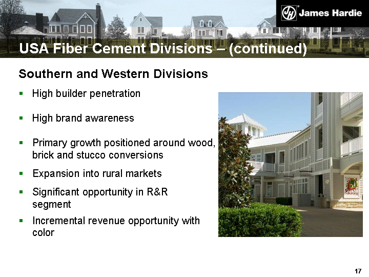 | USA Fiber Cement Divisions - (continued) Southern and Western Divisions High builder penetration High brand awareness Primary growth positioned around wood, vinyl, brick and stucco conversions Expansion into rural markets Significant opportunity in R&R segment Incremental revenue opportunity with color |
