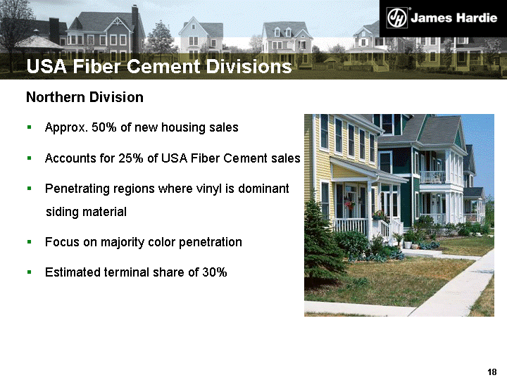 | USA Fiber Cement Divisions Northern Division Approx. 50% of new housing sales Accounts for 25% of USA Fiber Cement sales Penetrating regions where vinyl is dominant siding material Focus on majority color penetration Estimated terminal share of 30% |