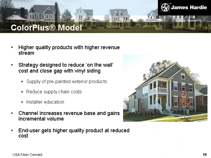 | ColorPlus(r) Model Higher quality products with higher revenue stream Strategy designed to reduce 'on the wall' cost and close gap with vinyl siding Supply of pre-painted exterior products Reduce supply chain costs Installer education Channel increases revenue base and gains incremental volume End-user gets higher quality product at reduced cost USA Fiber Cement |