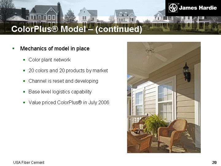 | ColorPlus(r) Model - (continued) Mechanics of model in place Color plant network 20 colors and 20 products by market Channel is reset and developing Base level logistics capability Value priced ColorPlus(r) in July 2006 USA Fiber Cement |