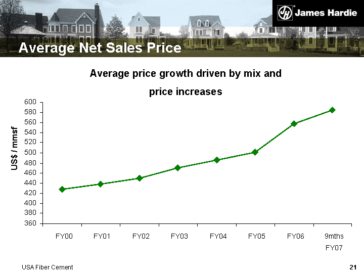 | Average Net Sales Price Average price growth driven by mix and price increases 360 380 400 420 440 460 480 500 520 540 560 580 600 FY00 FY01 FY02 FY03 FY04 FY05 FY06 9mths FY07 US$ / mmsf USA Fiber Cement |