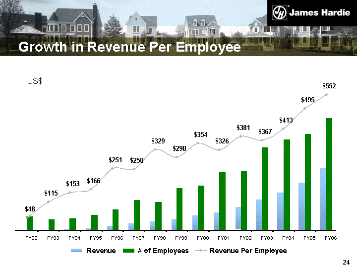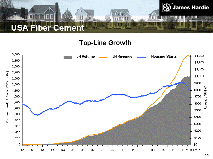 | USA Fiber Cement Top-Line Growth 0 200 400 600 800 1,000 1,200 1,400 1,600 1,800 2,000 2,200 2,400 2,600 2,800 3,000 90 91 92 93 94 95 96 97 98 99 00 01 02 03 04 05 Volume (mmsf) / Starts (000's Units) $0 $100 $200 $300 $400 $500 $600 $700 $800 $900 $1,000 $1,100 $1,200 $1,300 Revenue (US$M) JH Volume JH Revenue Housing Starts 06 YTD FY07 |