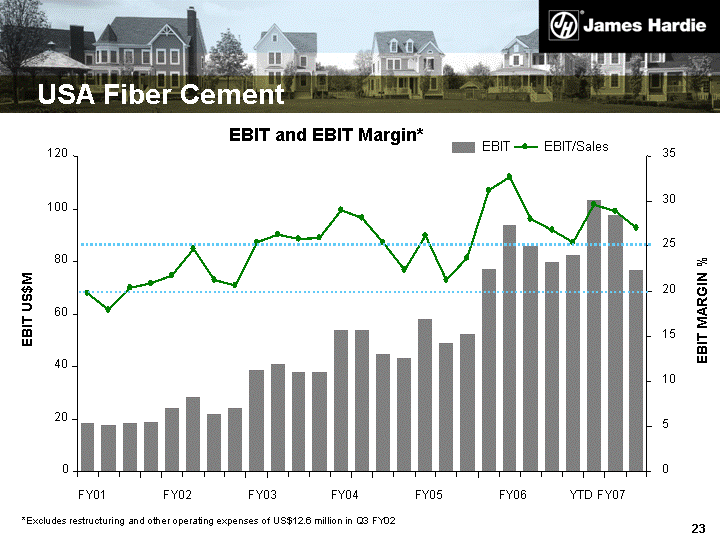 | USA Fiber Cement *Excludes restructuring and other operating expenses of US$12.6 million in Q3 FY02 EBIT and EBIT Margin* 0 20 40 60 80 100 120 FY01 FY02 FY03 FY04 FY05 FY06 YTD FY07 EBIT US$M 0 5 10 15 20 25 30 35 EBIT MARGIN % EBIT EBIT/Sales |