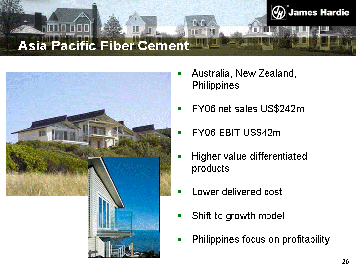 | Asia Pacific Fiber Cement Australia, New Zealand, Philippines FY06 net sales US$242m FY06 EBIT US$42m Higher value differentiated products Lower delivered cost Shift to growth model Philippines focus on profitability |