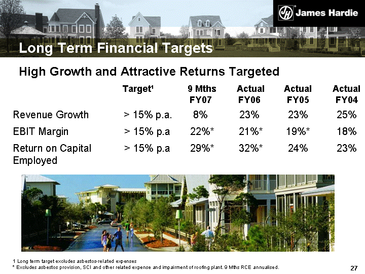 | High Growth and Attractive Returns Targeted Long Term Financial Targets Target1 9 Mths FY07 Actual FY06 Actual FY05 Actual FY04 Revenue Growth > 15% p.a. 8% 23% 23% 25% EBIT Margin > 15% p.a 22%* 21%* 19%* 18% Return on Capital Employed > 15% p.a 29%* 32%* 24% 23% 1 Long term target excludes asbestos-related expenses * Excludes asbestos provision, SCI and other related expense and impairment of roofing plant. 9 Mths RCE annualised. |