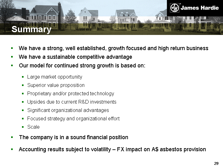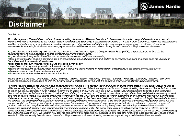 | Disclaimer Disclaimer This Management Presentation contains forward-looking statements. We may from time to time make forward-looking statements in our periodic reports filed with or furnished to the United States Securities and Exchange Commission on Forms 20-F and 6-K, in our annual reports to shareholders, in offering circulars and prospectuses, in media releases and other written materials and in oral statements made by our officers, directors or employees to analysts, institutional investors, representatives of the media and others. Examples of forward-looking statements include: expectations about the timing and amount of payments to the Asbestos Injuries Compensation Fund (AICF), a special purpose fund for the compensation of proven asbestos-related personal injury and death claims; expectations with respect to the effect on our financial statements of those payments; statements as to the possible consequences of proceedings brought against us and certain of our former directors and officers by the Australian Securities and Investments Commission; expectations that our credit facilities will be extended or renewed; projections of our operating results or financial condition; statements regarding our plans, objectives or goals, including those relating to competition, acquisitions, dispositions and our products; statements about our future performance; and statements about product or environmental liabilities. Words such as "believe," "anticipate," "plan," "expect," "intend," "target," "estimate," "project," "predict," "forecast," "guideline," "should," "aim" and similar expressions are intended to identify forward-looking statements but are not the exclusive means of identifying such statements. Forward-looking statements involve inherent risks and uncertainties. We caution you that a number of important factors could cause actual results to differ materially from the plans, objectives, expectations, estimates and intentions expressed in such forward-looking statements. These factors, some of which are discussed under "Risk Factors" beginning on page 5 of our Form 20-F filed on 29 September 2006 with the Securities and Exchange Commission, include but are not limited to: all matters relating to or arising out of the prior manufacture of products that contained asbestos by current and former James Hardie subsidiaries; required contributions to the AICF and the effect of foreign exchange on the amount recorded in our financial statements as an asbestos provision; compliance with and changes in tax laws and treatments; competition and product pricing in the markets in which we operate; the consequences of product failures or defects; exposure to environmental, asbestos or other legal proceedings; general economic and market conditions; the supply and cost of raw materials; the success of our research and development efforts; our reliance on a small number of product distributors; compliance with and changes in environmental and health and safety laws; risks of conducting business internationally; compliance with and changes in laws and regulations; foreign exchange risks; the successful implementation of new software systems; and the successful implementation of the internal control over financial reporting requirements of Section 404 of the Sarbanes-Oxley Act of 2002, as codified by Item 308 of regulation S-K. We caution you that the foregoing list of factors is not exhaustive and that other risks and uncertainties may cause actual results to differ materially from those in forward-looking statements. Forward-looking statements speak only as of the date they are made. |