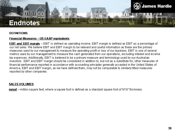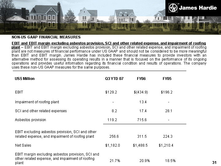 | NON-US GAAP FINANCIAL MEASURES EBIT and EBIT margin excluding asbestos provision, SCI and other related expense, and impairment of roofing plant - EBIT and EBIT margin excluding asbestos provision, SCI and other related expense, and impairment of roofing plant are not measures of financial performance under US GAAP and should not be considered to be more meaningful than EBIT and EBIT margin. James Hardie has included these financial measures to provide investors with an alternative method for assessing its operating results in a manner that is focused on the performance of its ongoing operations and provides useful information regarding its financial condition and results of operations. The company uses these non-US GAAP measures for the same purposes. US$ Million Q3 YTD 07 FY06 FY05 EBIT $129.2 $(434.9) $196.2 Impairment of roofing plant SCI and other related expenses Asbestos provision - 8.2 119.2 13.4 17.4 715.6 - 28.1 - EBIT excluding asbestos provision, SCI and other related expense, and impairment of roofing plant 256.6 311.5 224.3 Net Sales $1,182.0 $1,488.5 $1,210.4 EBIT margin excluding asbestos provision, SCI and other related expense, and impairment of roofing plant 21.7% 20.9% 18.5% |