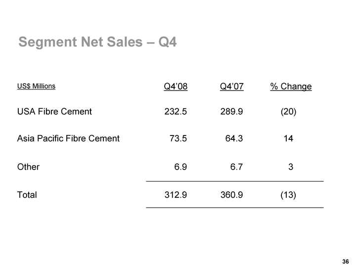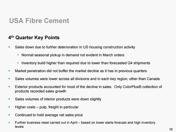 Fourth quarter net sales decreased 13% to US$312.9 million, gross profit was down 20% to