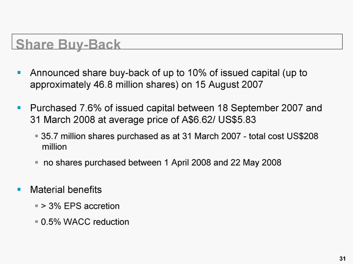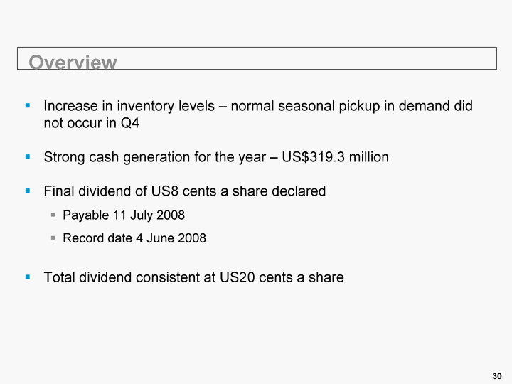 A dividend of US 8.0 cents per share/CUFS is payable to share/CUFS holders on 11 July 2008.